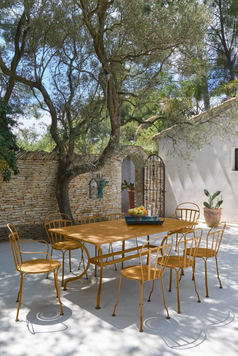 A masterclass in ironwork, each Louvre chairs is constructed from three different forms of the same material. The frame from steel rod, the backrest utilises flat strips of steel while the seat is a round of perforated sheet steel. The finished chair then enters Fermob's exclusive painting process to complete a timeless piece of outdoor furniture for generations to enjoy.